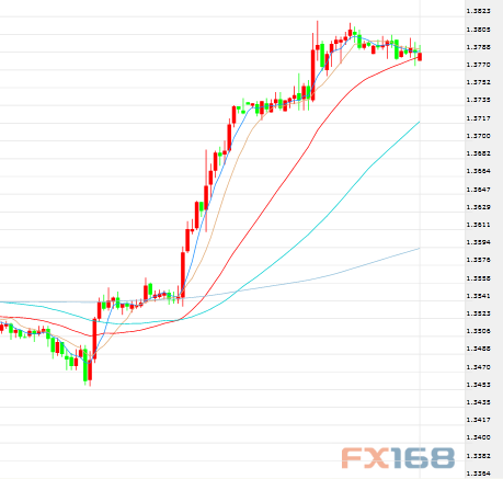 来看英镑方面,小时图显示,受益于美元疲弱,英镑/美元继昨日窜高后周二欧盘盘初仍保持高位交投的状态,截止发稿,价格企稳于1.3760上方,整体走势略有下跌。