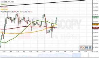 (现货黄金小时图,来源:Dukascopy,FX168财经网)