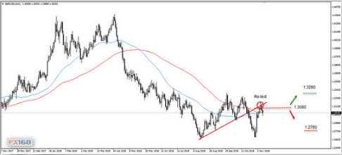 汇价此前的升势在触及1.3130-1.3150区域后有所抑制,技术面看缘于价格此前再次上探8月展开的上行趋势线阻力位水平,但多头上行动能不足无法在升破后持续攀升,使得价格升势很快耗尽迅速回撤。