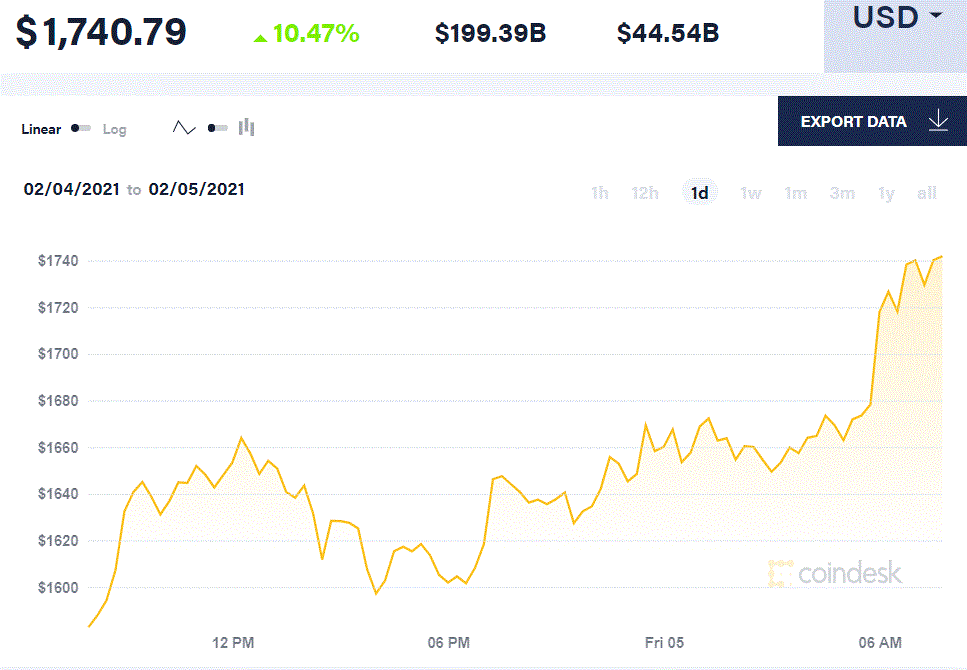 FX168财经报社(北美)讯 第二大的加密货币以太坊在周五(2月5日)创下历史新高,首次突破1700美元。CoinDesk的数据显示,以太坊价格上涨超过10%,至1742美元。