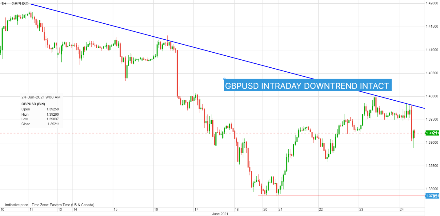 欧元/美元:优于预期的德国6月IFO商业景气指数提振了欧元/美元。报告显示,商业气候、当前评估和预期结果优于预期和5月读数,表明德国经济正从疫情中反弹。但这些数据不足以弥补欧洲央行的鸽派立场。欧洲央行计划维持货币政策不变,即便其它央行开始取消宽松政策。这对欧元/美元造成了压力,欧元/美元正在1.2000下方巩固损失。