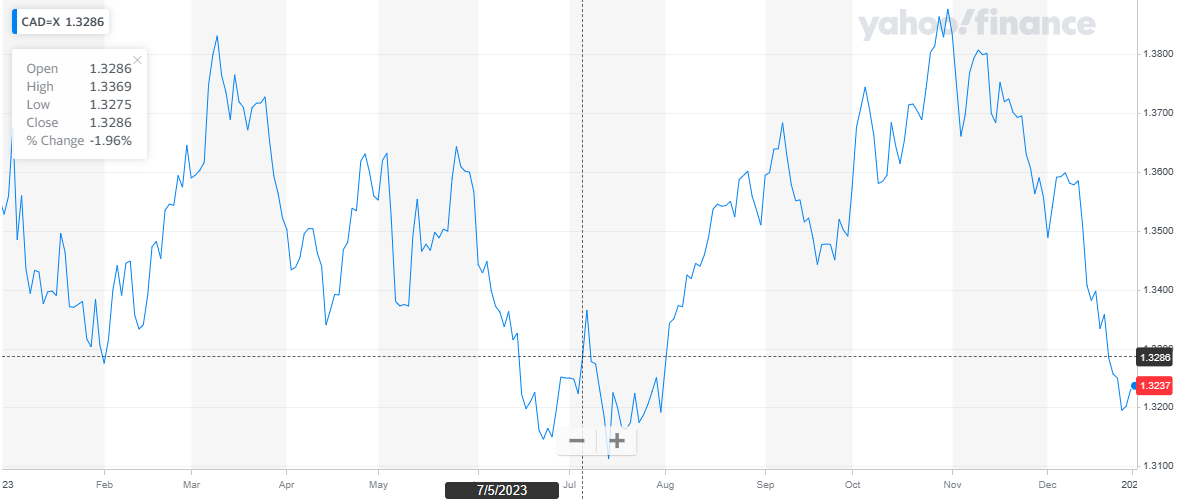 FX168财经报社(北美)讯 2023年,在通胀数据和央行加息以及降息预期的影响下,美元/加元震荡回落2.2%,收于1.3200一线。