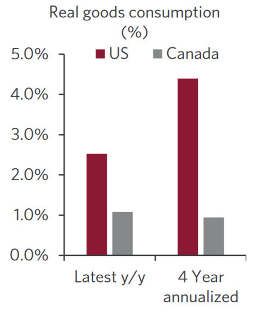 这是来自加拿大帝国商业银行(CIBC)的一个很好的图表。它突出显示了加拿大消费已经明显放缓,而在美国,消费品需求却继续上升。