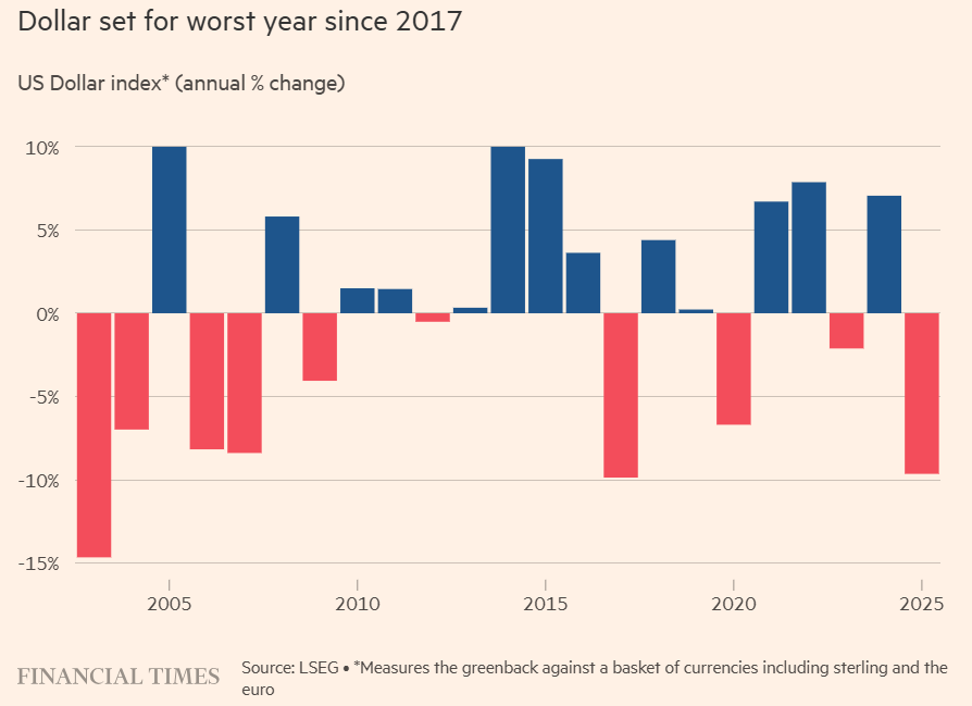 德意志银行外汇研究主管指出,美元今年的表现堪称自由浮动汇率时代中“极为罕见的疲弱年份”,反映市场对美国政策稳定性与资产回报结构的重新定价。