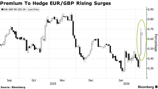 RBC驻伦敦外汇期权交易董事Jamie Sanders表示:“我们尤其看到市场对欧元/英镑上方(英镑走弱方向)期权的需求。”他补充称,这一需求推动该货币对的隐含波动率——即市场对价格波动预期的指标——被重新定价至“明显更高”的水平。