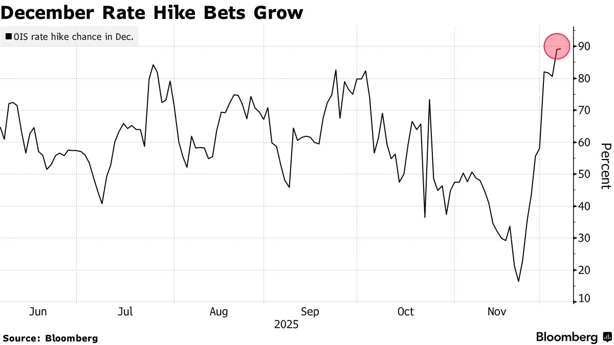 彭博周四还报道称,日本首相高市早苗政府的关键成员不会阻止日本央行在 12 月决定加息,尽管部分高级官员反对此时机。隔夜指数掉期显示,本月加息的概率已升至约 90%,一周前还不足 60%。