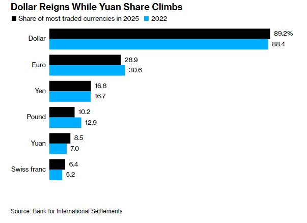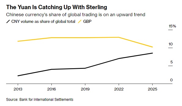 根据国际清算银行三年一次的调查,人民币目前占全球货币交易的8.5%,高于2022年的7.0%。尽管人民币仍是交易量第五大的货币,但与排名第四的英镑的差距正在缩小,英镑的份额从12.9%降至10.2%。