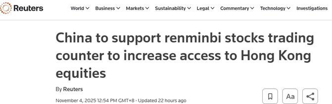 FX168财经报社(亚太)讯 英国路透社周二(11月4日)报道称,中国将支持把人民币股票交易柜台纳入港股通,这将首次允许内地投资者以人民币买卖在香港上市的股票。这是中国为加强两地市场联系、提升人民币国际地位而采取的最新政策举措。