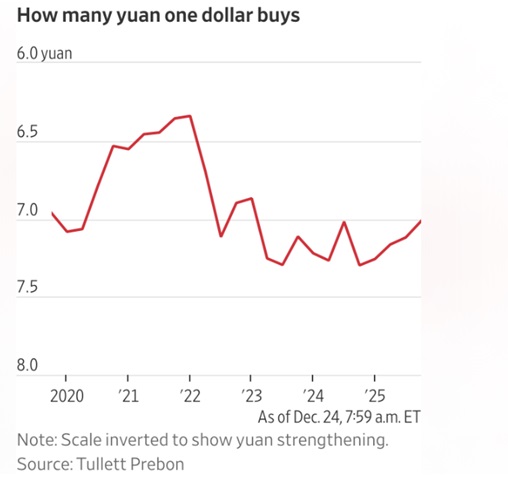 这两人说的是美元兑人民币的大幅走软。2025年这种情况没有发生,但包括高盛(Goldman Sachs)在内的一些机构预测,这是2026年值得关注的一个不确定因素。