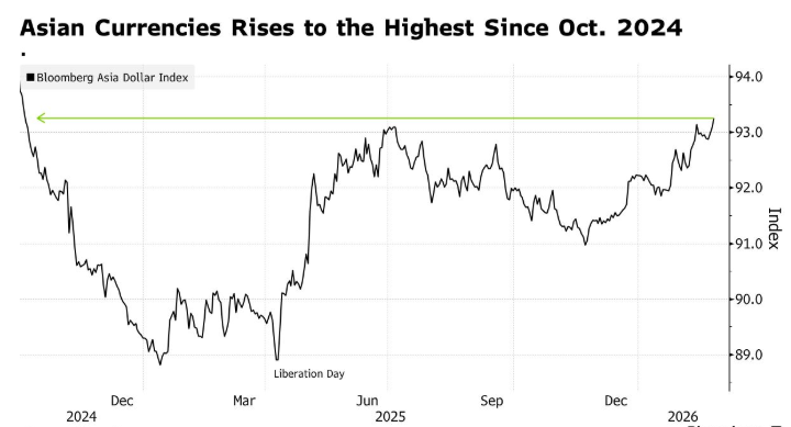 彭博亚洲美元指数上涨0.2%,触及自2024年10月以来的最高水平。受所谓“美元贬值交易”推动,亚洲新兴市场货币正在受益;围绕美国关税与财政政策的不确定性,正在削弱美元和美国债务资产的吸引力。