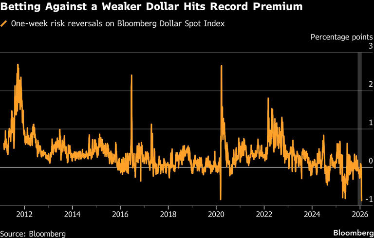 与此同时,美元交易员正以历史最高成本对冲美元进一步下跌风险。数据显示,短期限、押注美元走弱的期权溢价已升至彭博自2011年统计以来的最高水平;非美元货币的看涨预期也攀升至数月高位,接近或达到去年“解放日关税”后水平。
