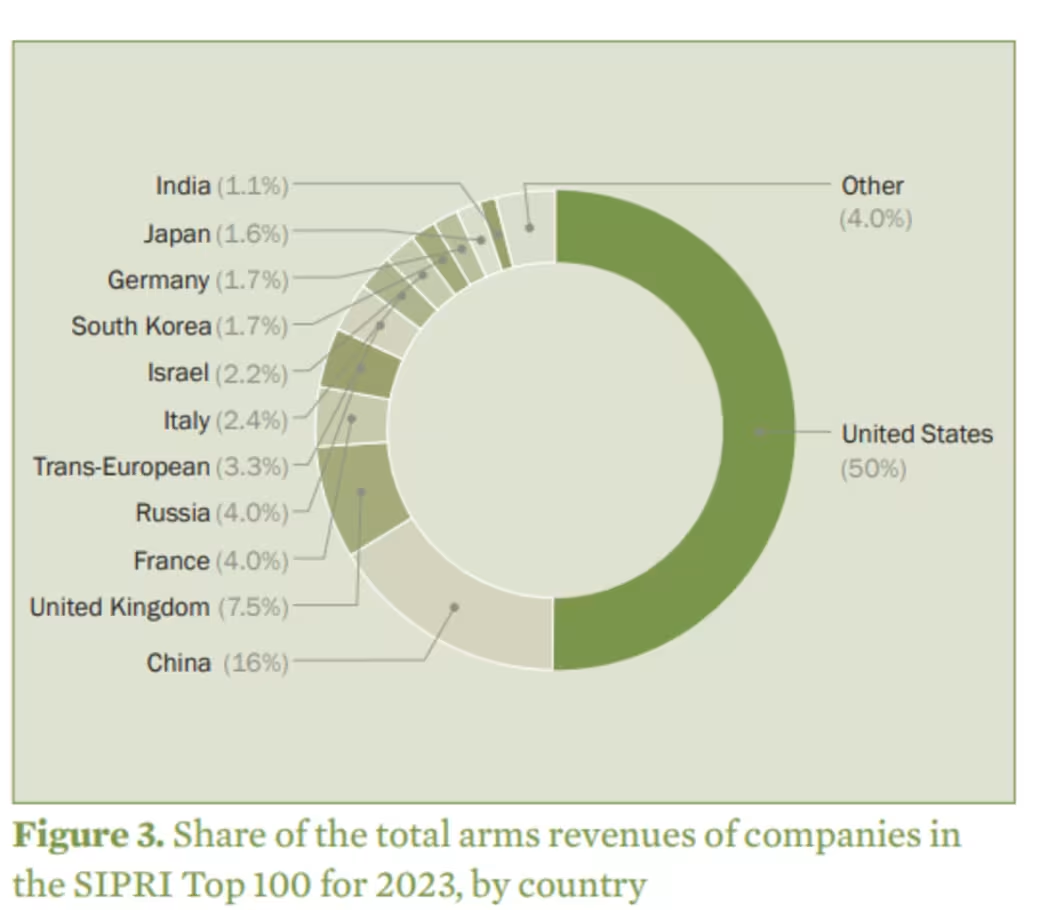 根据斯德哥尔摩国际和平研究所(SIPRI)最新数据,2023 年美国企业的军工收入为 3710 亿美元,占全球军工百强企业总收入的一半。
