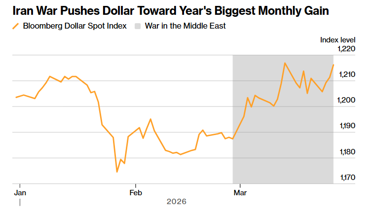 (伊朗战争推动美元迈向年内最大单月涨幅 来源:彭博)