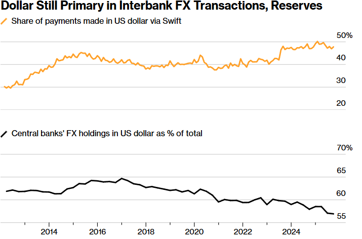 (美元仍是银行间外汇交易和外汇储备的主要货币 来源:Swift、国际货币基金组织)